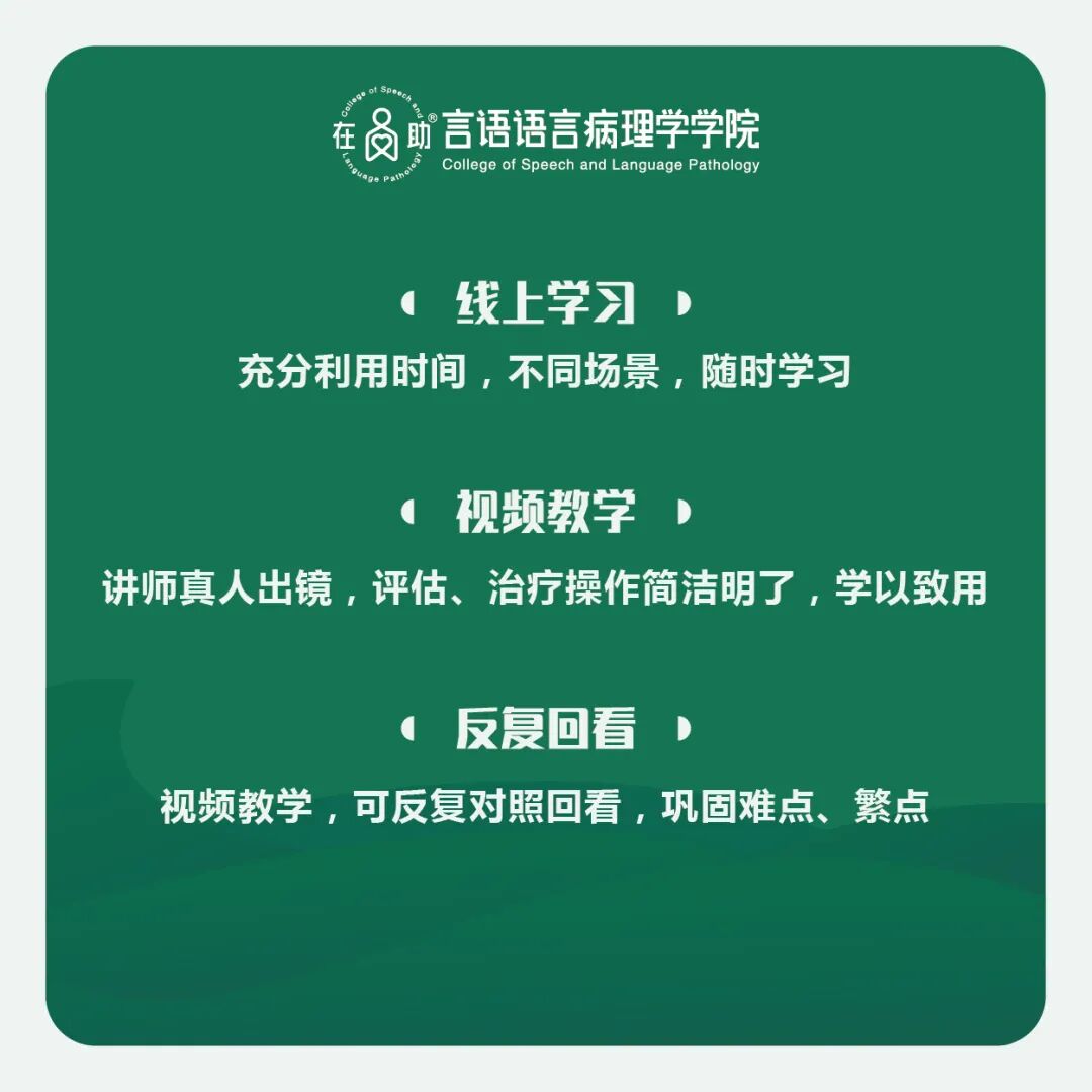• 学习完儿童言语治疗师职前线下课程的学员,可作为线下课程的视频复习课程,浓缩了线下的精华课程